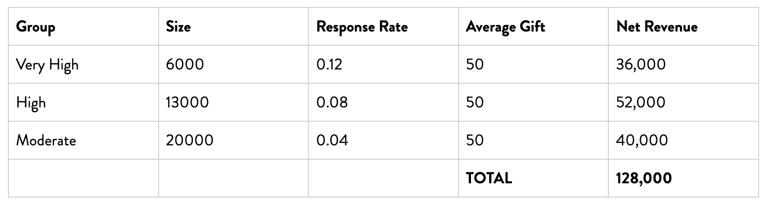 Here’s how the campaign net revenue would look per group, again assuming a $50 average gift (Net revenue = Size of Group * Response Rate * Average Gift).