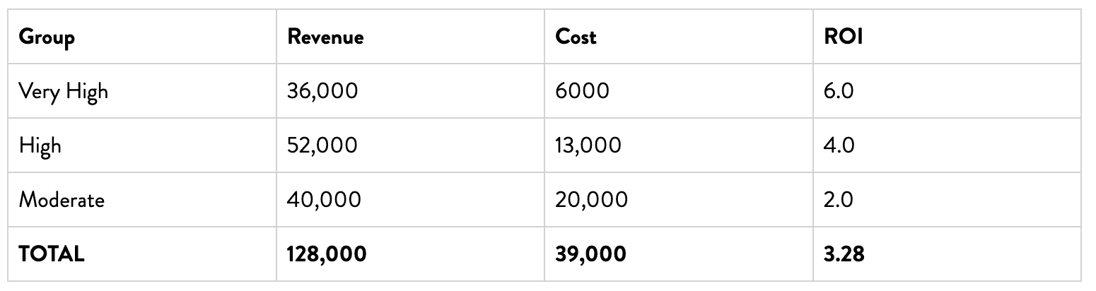 By excluding the ‘Very Low’ and ‘Low’ groups, savings of $11,000 are immediately made. The campaign is run targeting the remaining 39,000 potential donors.
