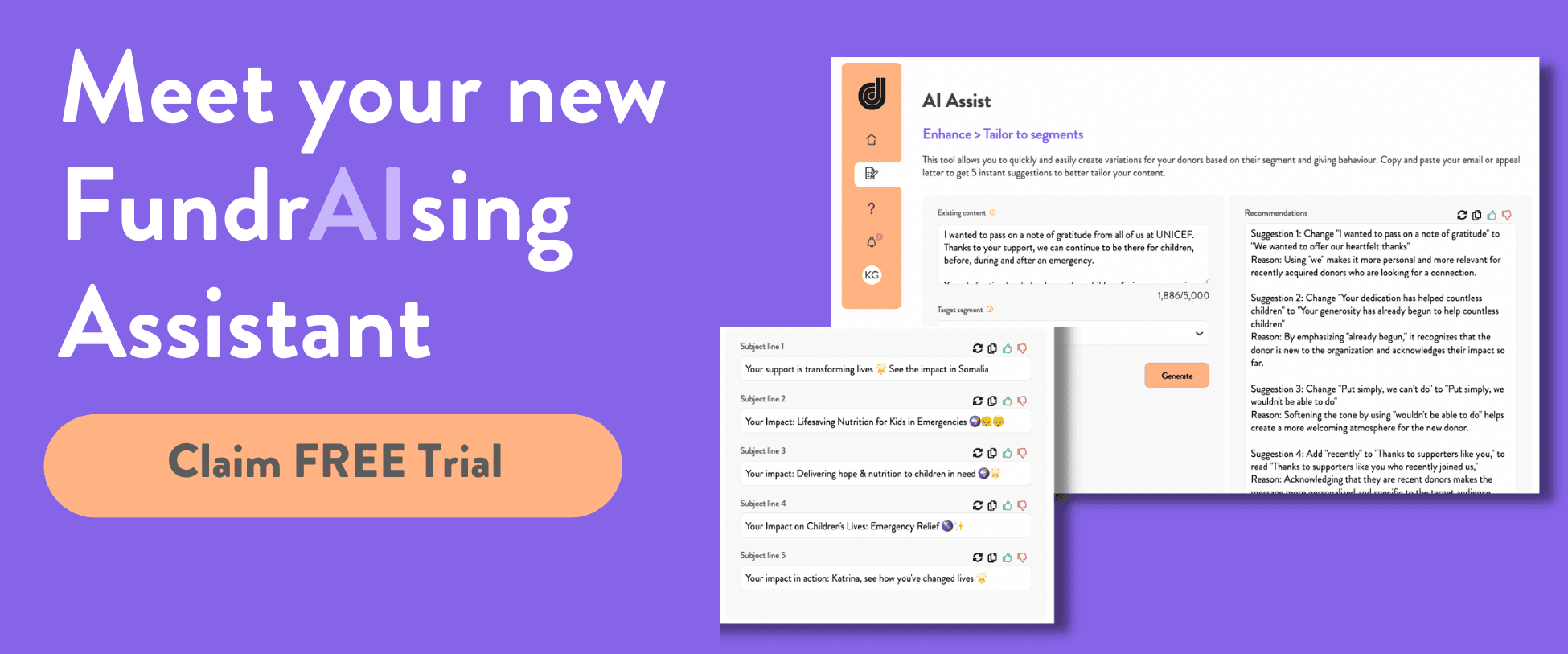 Time-strapped fundraising teams can use AI Assist to significantly improve their productivity (Watch Demo Here). With AI Assist fundraisers can quickly and easily generate first-draft fundraising content for appeal letters and emails, tailor the same piece of content for different donor segments, write personalized thank you letters, and even create eye-catching email subject lines that get their emails read.