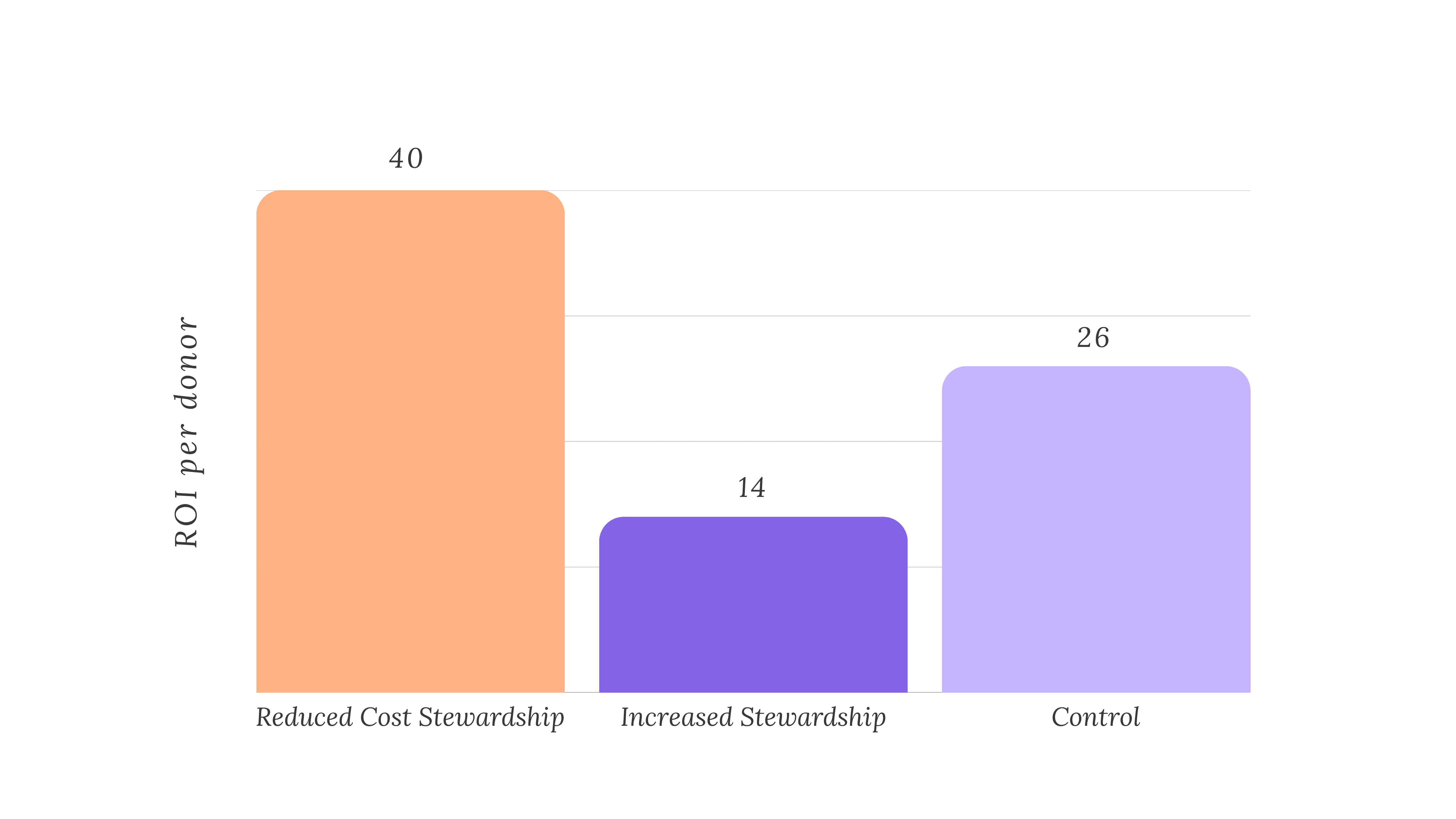 The reduced stewardship stream yielded the best ROI, with only a slight decrease in net revenue per donor ($35 lower than control).