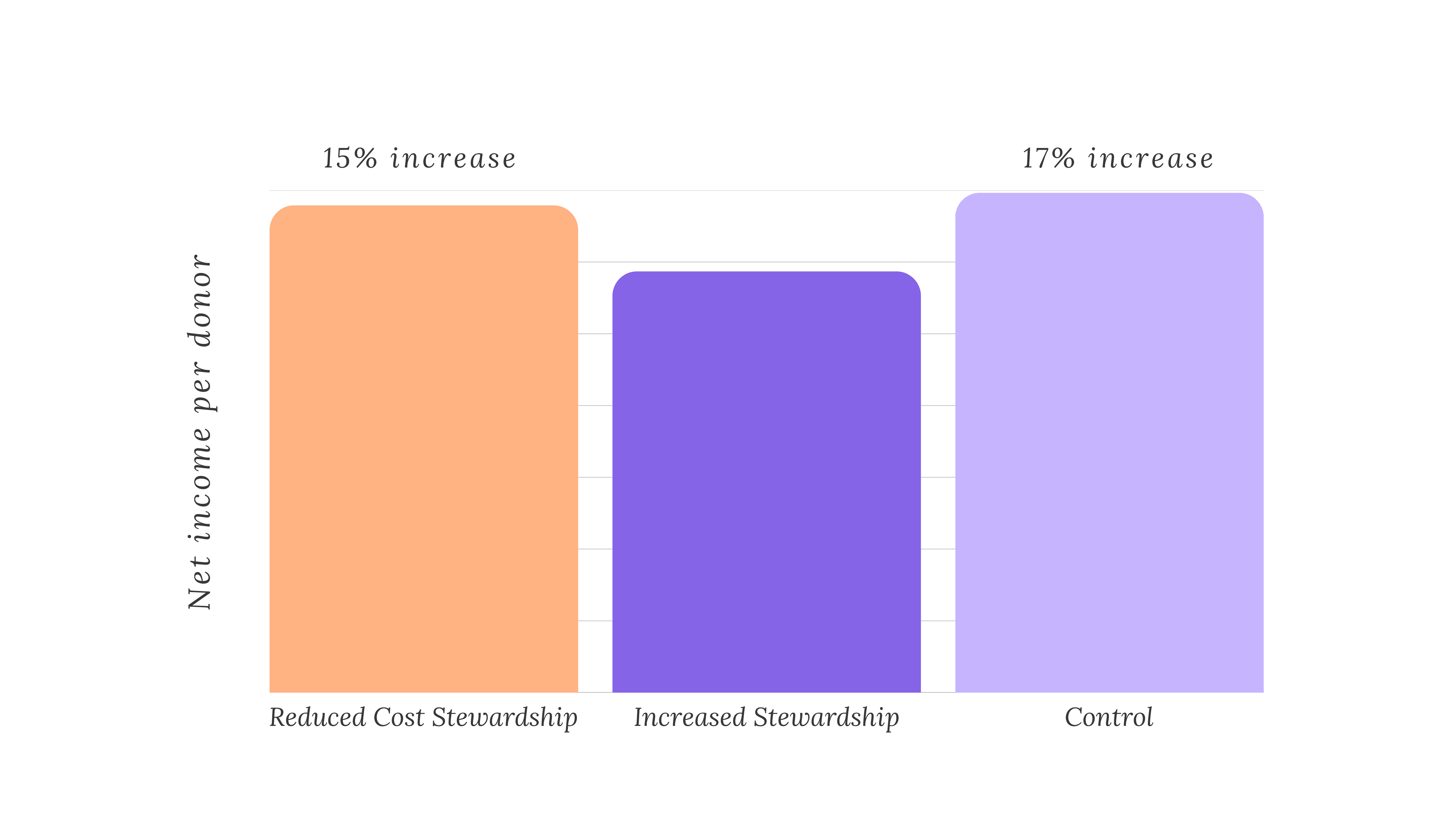 Donors in the increased stewardship stream didn’t give more than the control or reduced stewardship group to justify the increased level of stewardship (net revenue per donor was $200 lower than the control).
