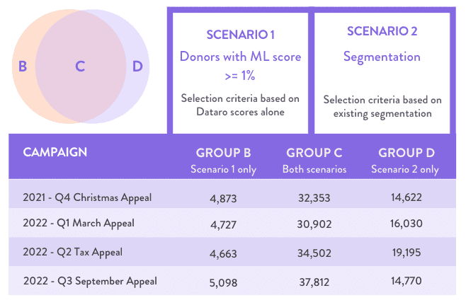 Of course, there is a large overlap between the two cohorts as many donors with a high propensity score also fall into one of the segments the charity would normally include in their targeting.