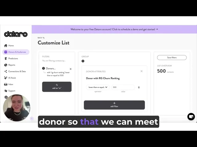 Dataro's predictive AI models help nonprofits identify high-potential donor audiences for recurring giving. Predict which one-time donors are likely to convert to monthly giving and then target them with personalized asks and communications.
